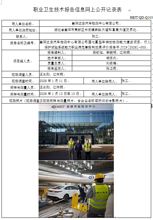 襄陽達(dá)安汽車檢測中心有限公司國七重型車排放檢測能力建設(shè)項(xiàng)目、行人保護(hù)試驗(yàn)系統(tǒng)能力職業(yè)病危害控制效果評價(jià)報(bào)告書